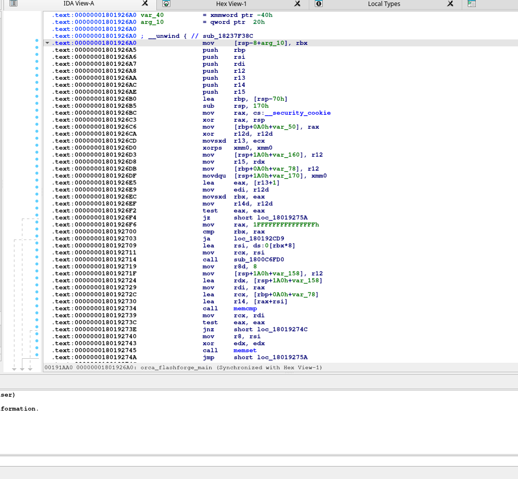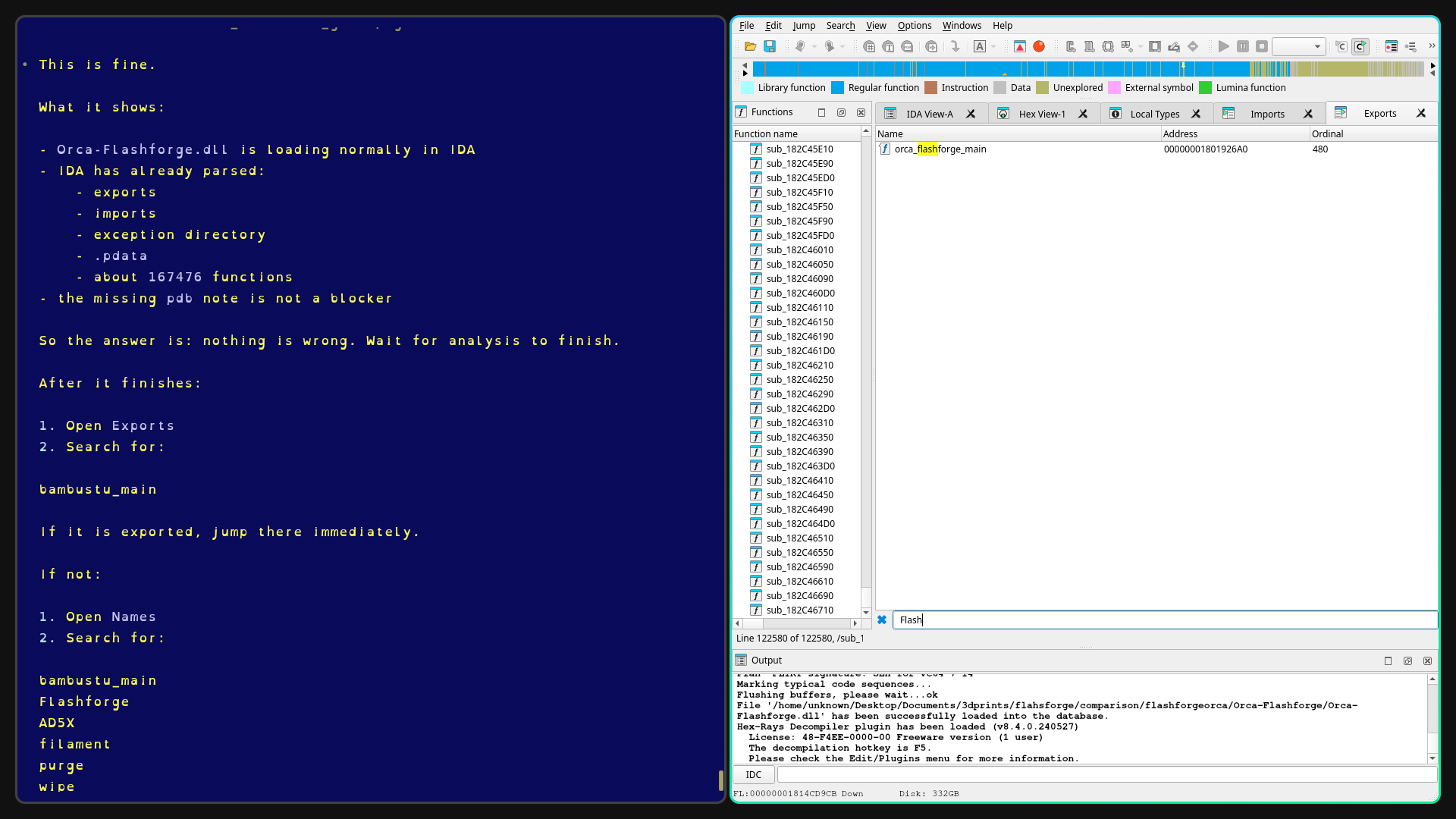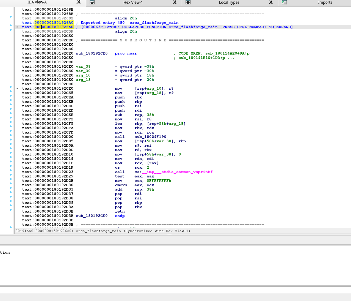 | 1 | Stay inside Orca-Flashforge.dll and keep tracing from orca_flashforge_main through sub_180125CE0 and sub_1801BB100 |